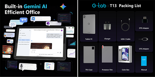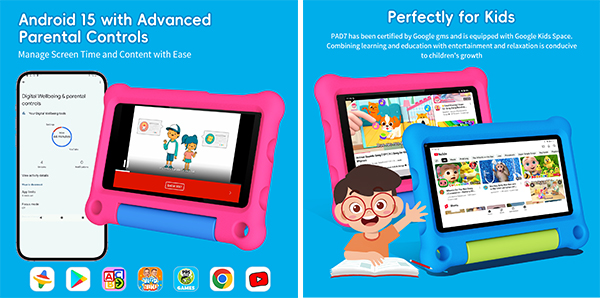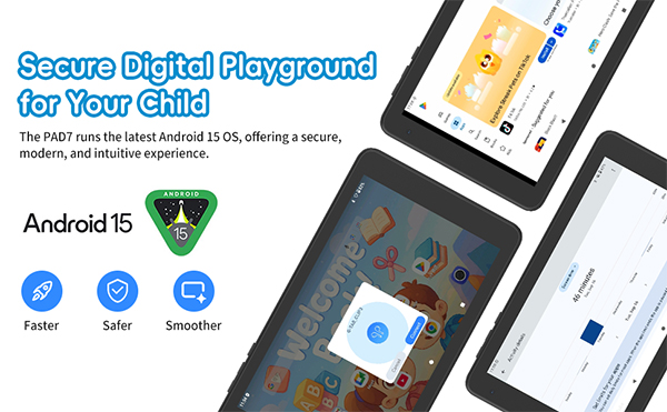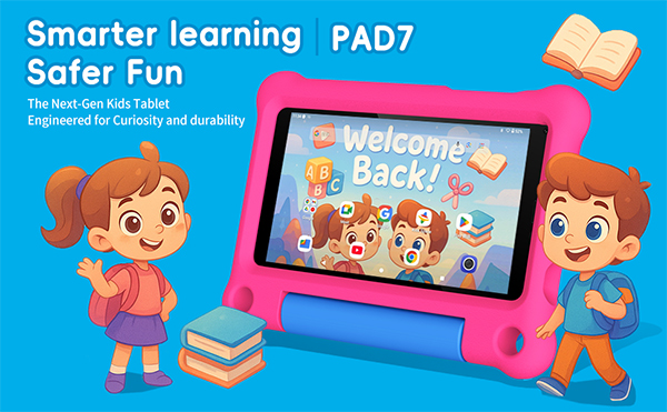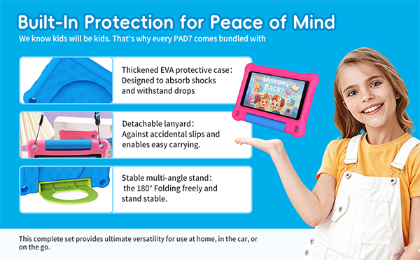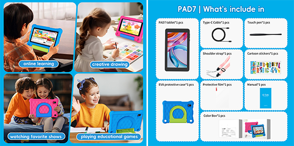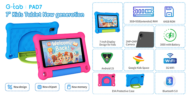 Made for Kids - Built for Fun & Learning Meet the G-Tab PAD7, theultimate kids' tablet designed to keep little ones entertained and parentsworry-free. With a 7-inch IPS display and the latest Android 15, it deliverssmooth performance powered by the Allwinner A333 processor.Packed with 64GB storage + 3GB RAM (expandable up to 8GB) andsupport for 256GB MicroSD, there's plenty of room for apps, games,and learning tools. Child Mode keeps kids safe, while features like split-screen make it easy to multitask. Available in Pink or Blue, the PAD7comes ready-to-go with an EVA protective case, touch pen, andshoulder strap included.A tablet that's safe, colorful, and perfectlydesigned for kids.